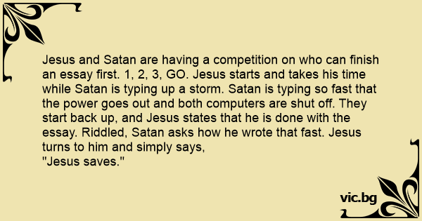 Jesus and Sатаn are having a competition on who can finish an essay first. 1, 2, 3, GO. Jesus starts and takes his time while Sатаn is typing up a storm. Sатаn is typing so fast that the power goes out and both computers are shut off. They start back up, and Jesus states that he is done with the essay. Riddled, Sатаn asks how he wrote that fast. Jesus turns to him and simply says,