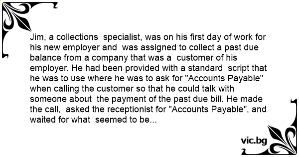 Jim, a collections specialist, was on his first day of work for his new employer and was assigned to collect a past due balance from a company that was a customer of his employer. He had been provided with a standard script that he was to use where he was to ask for "Accounts Payable" when calling the customer so that he could talk with someone about the payment of the past due bill. He made the call, asked the receptionist for "Accounts Payable", and waited for what seemed to be forever on hold. Finally, after a very long time, the blonde receptionist, who was also on her first day on the job and new to the world of business, came back on the phone and stated, "I am sorry, but I have looked down our list of employees and I do not find anyone named Accounts Payable."
