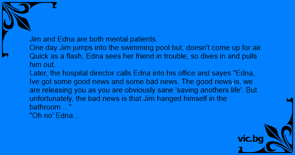 Later, the hospital director calls Edna into his office and sayes "Edna, Ive got some good news and some bad news. The good news is, we are releasing you as you are obviously sane 'saving anothers life'. But unfortunately, the bad news is that Jim hanged himself in the bathroom ..."