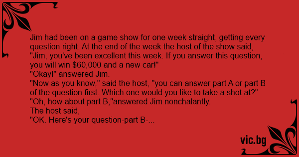 "Now as you know," said the host, "you can answer part A or part B of the question first. Which one would you like to take a shot at?"