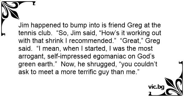 Jim happened to bump into is friend Greg at the tennis club. “So, Jim said, “How’s it working out with that shrink I recommended.” “Great,” Greg said. “I mean, when I started, I was the most arrogant, self-impressed egomaniac on God’s green earth.” Now, he shrugged, “you couldn’t ask to meet a more terrific guy than me.”