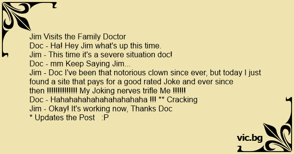 Jim - Doc I've been that notorious clown since ever, but today I just found a site that pays for a good rated Joke and ever since then !!!!!!!!!!!!!! My Joking nerves trifle Me !!!!!!