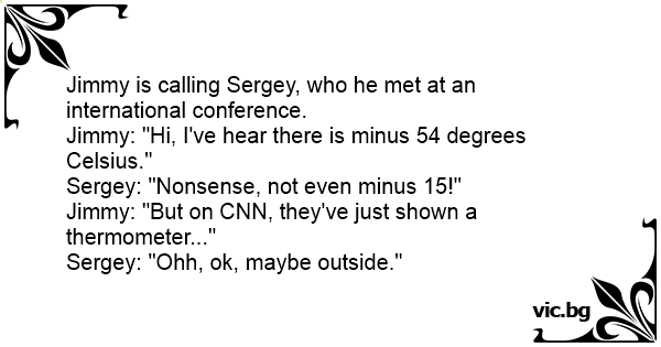 Két jó barát telefonon beszélget. Az egyik orosz, a távoli tajgáról, a másik a napfényes Floridából. - Te Szása, nálatok tényleg -50 fok van? - Áááá, dehogy is. Kb olyan -10-15 fok lehet. - De...