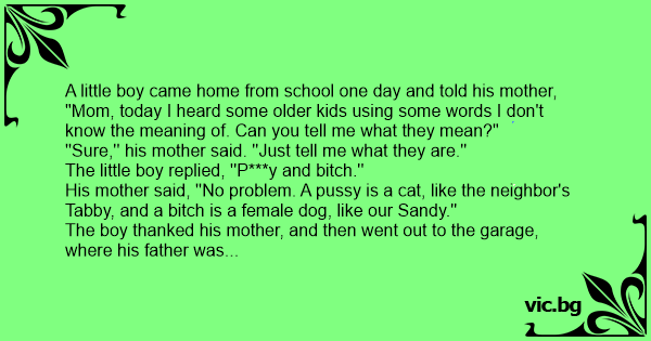 His mother said, ''No problem. A рussy is a cat, like the neighbor's Tabby, and a вiтсh is a female dog, like our Sandy.''
