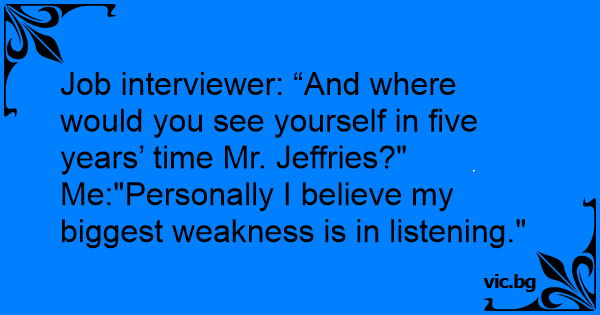 Job interviewer: “And where would you see yourself in five years’ time Mr. Jeffries?"