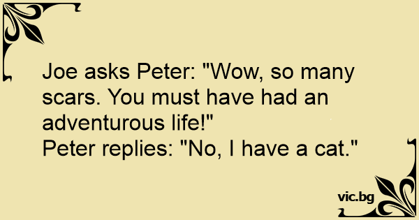 Joe asks Peter: "Wow, so many scars. You must have had an adventurous life!"