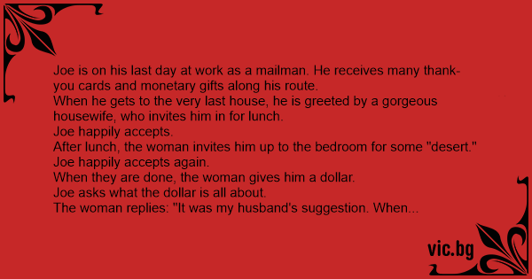 Finally, it was Ned the Mailman’s last day. As he did his final rounds, he reached the door of the first house and was greeted by a elderly couple who gave him a gift certificate. At the next...