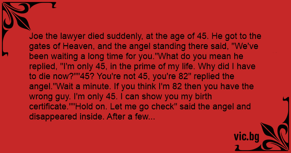 Joe the lawyer died suddenly, at the age of 45. He got to the gates of Heaven, and the angel standing there said, "We've been waiting a long time for you."What do you mean he replied, "I'm only 45, in the prime of my life. Why did I have to die now?""45? You're not 45, you're 82" replied the angel."Wait a minute. If you think I'm 82 then you have the wrong guy. I'm only 45. I can show you my birth certificate.""Hold on. Let me go check" said the angel and disappeared inside. After a few minutes the angel returned."Sorry, but by our records you *are* 82. I checked all the hours you have billed your clients, and you have to be 82..."