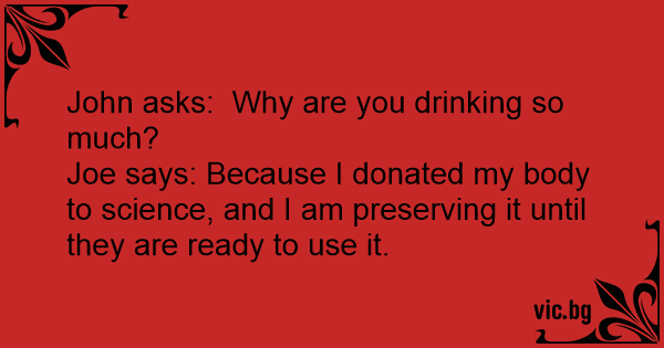 John asks: Why are you drinking so much? <br />Joe says: Because I donated my body to science, and I am preserving it until they are ready to use it.
