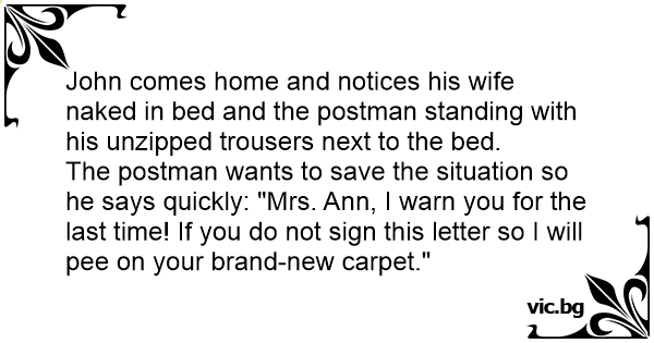 John comes home and notices his wife nакеd in bed and the postman standing with his unzipped trousers next to the bed.