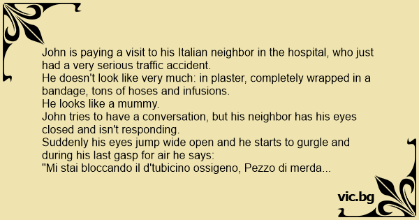 John is paying a visit to his Italian neighbor in the hospital, who just had a very serious traffic accident.