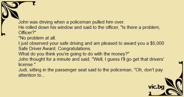 En polis stoppar en bil och säger: - Grattis ! Du har precis vunnit 1 miljon. Vad ska du göra med pengarna? - Jag tror jag ska skaffa körkort. Frun som sitter bredvid säger: - Lyssna inte på honom....