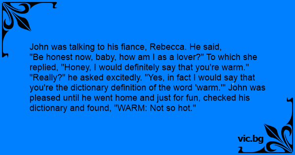 "Really?" he asked excitedly. "Yes, in fact I would say that you're the dictionary definition of the word 'warm.'" John was pleased until he went home and just for fun, checked his dictionary and found, "WARM: Not so hot."