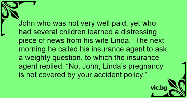 John who was not very well paid, yet who had several children learned a distressing piece of news from his wife Linda. The next morning he called his insurance agent to ask a weighty question, to which the insurance agent replied, “No, John, Linda’s pregnancy is not covered by your accident policy.”