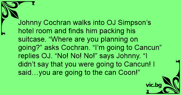 Johnny Cochran walks into OJ Simpson’s hotel room and finds him packing his suitcase. “Where are you planning on going?” asks Cochran. “I’m going to Cancun” replies OJ. “No! No! No!” says Johnny. “I didn’t say that you were going to Cancun! I said…you are going to the can Сооn!”
