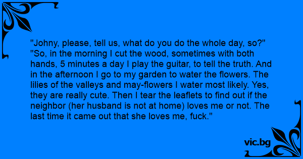 "So, in the morning I cut the wood, sometimes with both hands, 5 minutes a day I play the guitar, to tell the truth. And in the afternoon I go to my garden to water the flowers. The lilies of the valleys and may-flowers I water most likely. Yes, they are really cute. Then I tear the leaflets to find out if the neighbor (her husband is not at home) loves me or not. The last time it came out that she loves me, fuск."