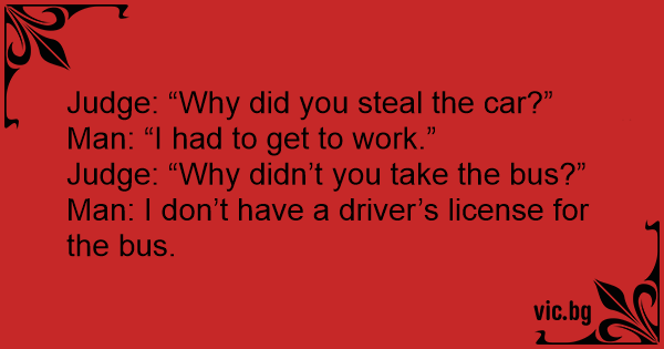 “Warum haben Sie denn das Auto gestohlen?” “Ich musste dringend zur Arbeit, Herr Richter.” “Ja, und warum haben Sie nicht einfach den Bus genommen?” “Weil mein Führerschein für Busse nicht gilt!”