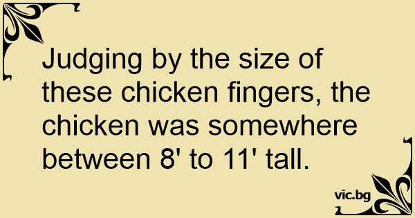 Judging by the size of these chicken fingers, the chicken was somewhere between 8' to 11' tall.