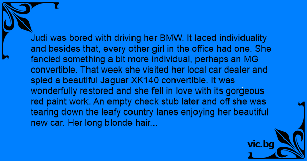 Judi was bored with driving her BMW. It laced individuality and besides that, every other girl in the office had one. She fancied something a bit more individual, perhaps an MG convertible. That week she visited her local car dealer and spied a beautiful Jaguar XK140 convertible. It was wonderfully restored and she fell in love with its gorgeous red paint work. An empty check stub later and off she was tearing down the leafy country lanes enjoying her beautiful new car. Her long blonde hair was flowing in the wind, music blaring from the radio, what could possibly go wrong?