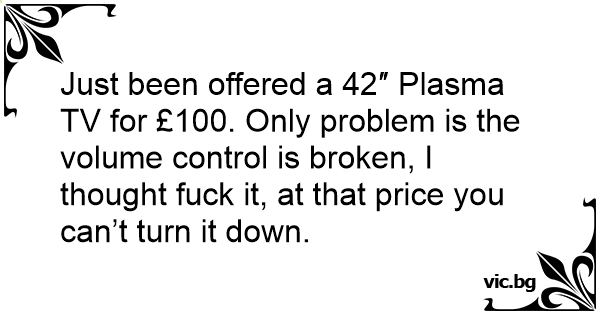 Just been offered a 42″ Plasma TV for £100. Only problem is the volume control is broken, I thought fuск it, at that price you can’t turn it down.