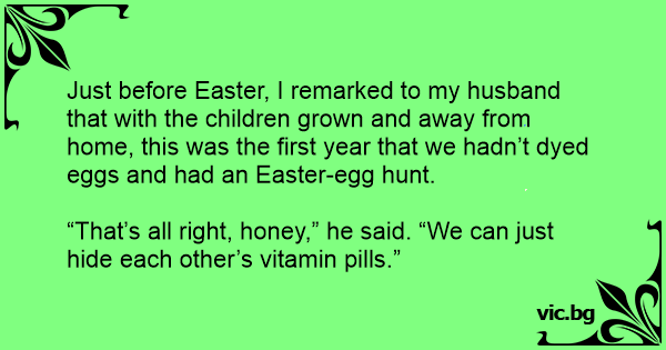 “That’s all right, honey,” he said. “We can just hide each other’s vitamin pills.”