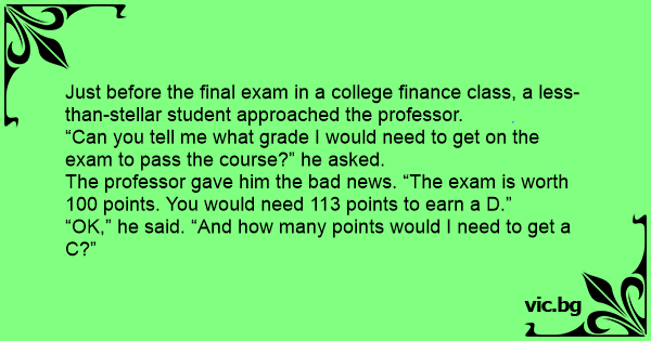 The professor gave him the bad news. “The exam is worth 100 points. You would need 113 points to earn a D.”