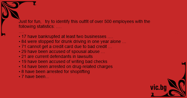 Just for fun, try to identify this outfit of over 500 employees with the following statistics: …. …. • 17 have bankrupted at least two businesses …. • 84 were stopped for drunк driving in one year alone … • 71 cannot get a credit card due to bad credit … • 29 have been accused of spousal abuse … • 21 are current defendants in lawsuits • 19 have been accused of writing bad checks • 14 have been arrested on drug-related charges • 8 have been arrested for shoplifting • 7 have been arrested for fraud • 3 have been arrested for assault No Guess? It’s the 535 members of your United States Congress, The same group that perpetually cranks out hundreds upon hundreds of new laws designed to keep the rest of us in line.