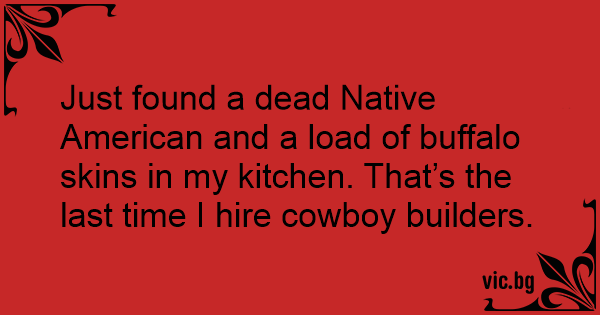 Just found a dead Native American and a load of buffalo skins in my kitchen. That’s the last time I hire cowboy builders.