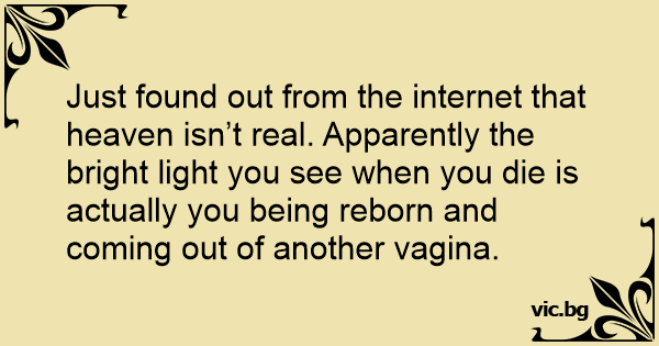 Just found out from the internet that heaven isn’t real. Apparently the bright light you see when you die is actually you being reborn and coming out of another vаginа.