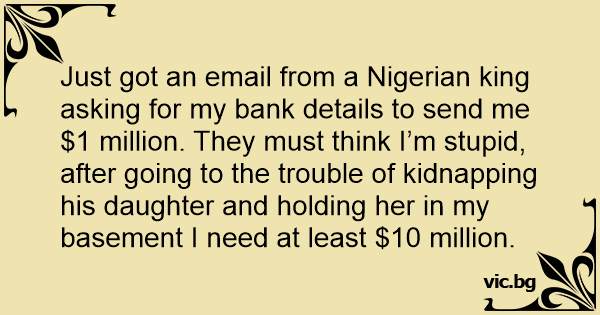 Just got an email from a Nigerian king asking for my bank details to send me $1 million. They must think I’m sтuрid, after going to the trouble of kidnapping his daughter and holding her in my basement I need at least $10 million.