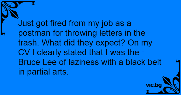 Just got fired from my job as a postman for throwing letters in the trash. What did they expect? On my CV I clearly stated that I was the Bruce Lee of laziness with a black belt in partial arts.