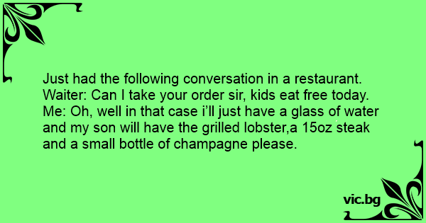 Me: Oh, well in that case i’ll just have a glass of water and my son will have the grilled lobster,a 15oz steak and a small bottle of champagne please.