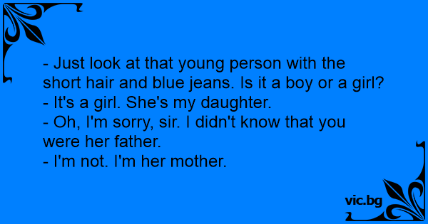 Duas pessoas puxam conversa numa festa: — Que pessoa estranha aquela! Não dá para saber se é ele ou ela! — É ela. É minha filha. — Pô, desculpa aí! Não teria dito isso se soubesse que o senhor é pai dela. — Mas eu não sou o pai dela. Sou a mãe.