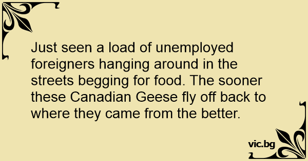 Just seen a load of unemployed foreigners hanging around in the streets begging for food. The sooner these Canadian Geese fly off back to where they came from the better.