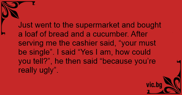 Just went to the supermarket and bought a loaf of bread and a cucumber. After serving me the cashier said, “your must be single”. I said “Yes I am, how could you tell?”, he then said “because you’re really ugly”.