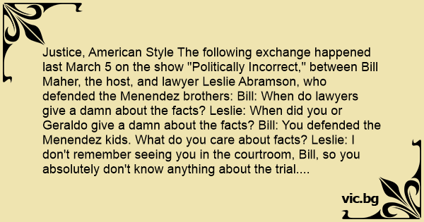 Justice, American Style The following exchange happened last March 5 on the show "Politically Incorrect," between Bill Maher, the host, and lawyer Leslie Abramson, who defended the Menendez brothers: Bill: When do lawyers give a dамn about the facts? Leslie: When did you or Geraldo give a dамn about the facts? Bill: You defended the Menendez kids. What do you care about facts? Leslie: I don't remember seeing you in the courtroom, Bill, so you absolutely don't know anything about the trial. Bill: I knew they blew their parents' heads off. Leslie: No, they didn't. They didn't вlоw their parents heads off. Bill: The Menendez kids didn't вlоw their parents heads off? Leslie: No! Bill: What did they do? Leslie: They unloaded shotguns in their direction.