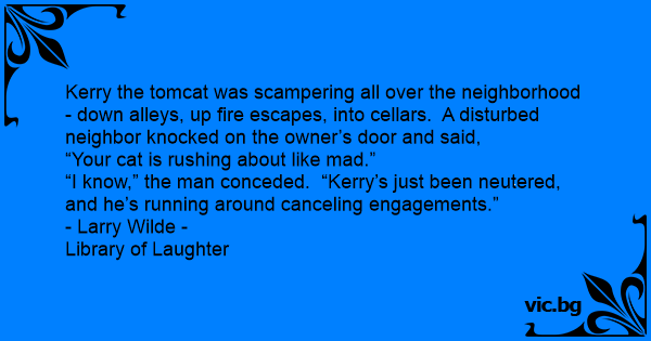 Kerry the tomcat was scampering all over the neighborhood - down alleys, up fire escapes, into cellars. A disturbed neighbor knocked on the owner’s door and said,