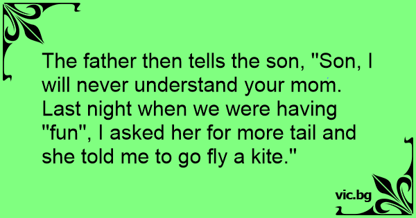 Last night when we were having ''fun'', I asked her for more tail and she told me to go fly a kite.''