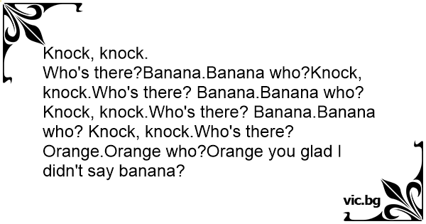 Who's there?Banana.Banana who?Knock, knock.Who's there? Banana.Banana who?Knock, knock.Who's there? Banana.Banana who? Knock, knock.Who's there? Orange.Orange who?Orange you glad I didn't say banana?