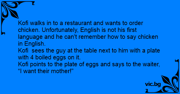 Kofi walks in to a restaurant and wants to order chicken. Unfortunately, English is not his first language and he can't remember how to say chicken in English.