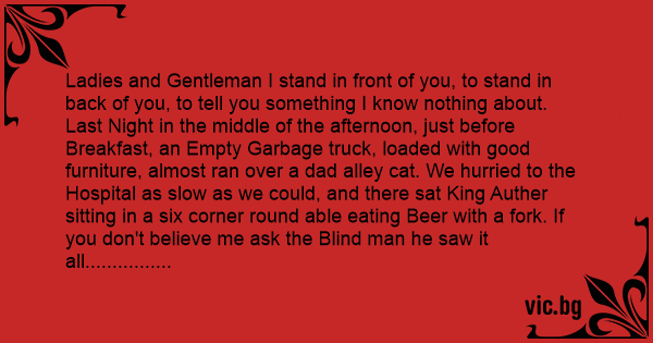 Ladies and Gentleman I stand in front of you, to stand in back of you, to tell you something I know nothing about. Last Night in the middle of the afternoon, just before Breakfast, an Empty Garbage truck, loaded with good furniture, almost ran over a dad alley cat. We hurried to the Hospital as slow as we could, and there sat King Auther sitting in a six corner round able eating Вееr with a fork. If you don't believe me ask the Blind man he saw it all................