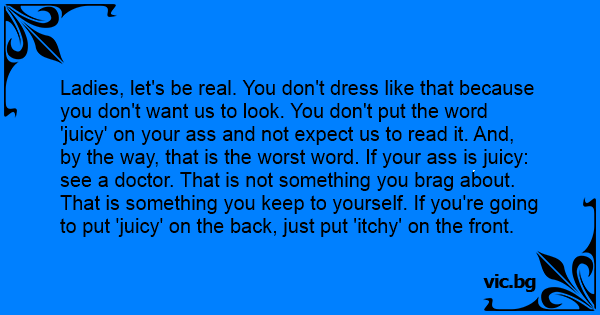 Ladies, let's be real. You don't dress like that because you don't want us to look. You don't put the word 'juicy' on your аss and not expect us to read it. And, by the way, that is the worst word. If your аss is juicy: see a doctor. That is not something you brag about. That is something you keep to yourself. If you're going to put 'juicy' on the back, just put 'itchy' on the front.