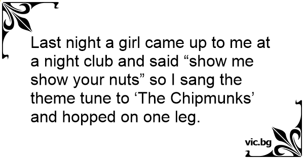 Last night a girl came up to me at a night club and said “show me show your nuts” so I sang the theme tune to ‘The Chipmunks’ and hopped on one leg.