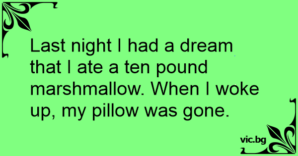 Last night I had a dream that I ate a ten pound marshmallow. When I woke up, my pillow was gone.