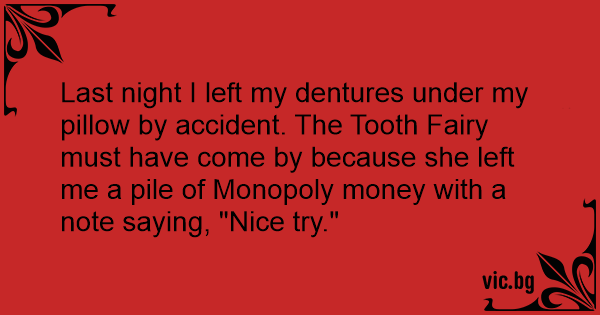 Last night I left my dentures under my pillow by accident. The Tooth Fairy must have come by because she left me a pile of Monopoly money with a note saying, "Nice try."