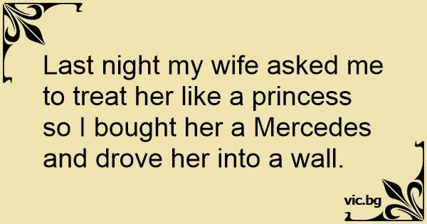 Last night my wife asked me to treat her like a princess so I bought her a Mercedes and drove her into a wall.