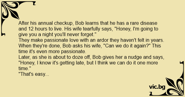 They make passionate love with an ardor they haven't felt in years. When they're done, Bob asks his wife, "Can we do it again?" This time it's even more passionate.