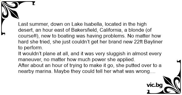 Last summer, down on Lake Isabella, located in the high desert, an hour east of Bakersfield, California, a blonde (of course!!), new to boating was having problems. No matter how hard she tried, she just couldn’t get her brand new 22ft Bayliner to perform.