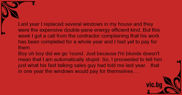Boy oh boy did we go 'round. Just because I'm blonde doesn't mean that I am automatically sтuрid. So, I proceeded to tell him just what his fast talking sales guy had told me last year. . that in one year the windows would pay for themselves. There was silence on the other end of the line so I just hung up and I haven't heard back.