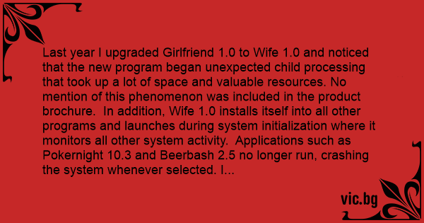 Last year I upgraded Girlfriend 1.0 to Wife 1.0 and noticed that the new program began unexpected child processing that took up a lot of space and valuable resources. No mention of this phenomenon was included in the product brochure. In addition, Wife 1.0 installs itself into all other programs and launches during system initialization where it monitors all other system activity. Applications such as Pokernight 10.3 and Beerbash 2.5 no longer run, crashing the system whenever selected. I cannot seem to purge Wife 1.0 from my system. I am thinking about going back to Girlfriend 1.0 but un-install does not work on this program. Can you help me? - Mr I N Distress Dear I N Distress, This is a very common problem men complain about but is mostly due to a primary misconception. Many people upgrade from Girlfriend 1.0 to Wife 1.0 with the idea that Wife 1.0 is merely a "UTILITIES & ENTERTAINMENT" program. Wife 1.0 is an OPERATING SYSTEM and designed by its creator to run everything. WARNING DO NOT TRY TO un-install, delete, or purge the program from the system once installed. Trying to un-install Wife 1.0 can be disastrous. You can not go back to Girlfriend 1.0 because Wife 1.0 is not designed to do this. Some have tried to install Girlfriend 2.0 or Wife 2.0 but end up with more problems than the original system. Look in your manual under Warnings-Alimony/Child Support. Others have tried to run Girlfriend 2.0 in the background, while Wife 1.0 is running. Eventually Wife 1.0 detects the presence of Girlfriend 2.0 and a system conflict occurs, this can lead to a non-recoverable system crash. Some users have tried to download similar products such as Fling and 1NiteStand. Often their systems have become infected with a virus. I recommend you keep Wife 1.0 and just deal with the situation. Having Wife 1.0 installed myself, I might also suggest you read the entire section regarding General Protection Faults (GPFs). You must assume all responsibility for faults and problems that might occur. The best course of action will be to push the apologize button then reset button as soon as lock-up occurs. The system will run smooth as long as you take the blame for all GPFs. Wife 1.0 is a great program but is very high maintenance. Suggestions for improved operation of Wife 1.0 -Monthly use utilities such as TLC and FTD -Frequently use Communicator 5.0 With best wishes, Tech Support. Submitted by calamjo Edited by Tantilazing